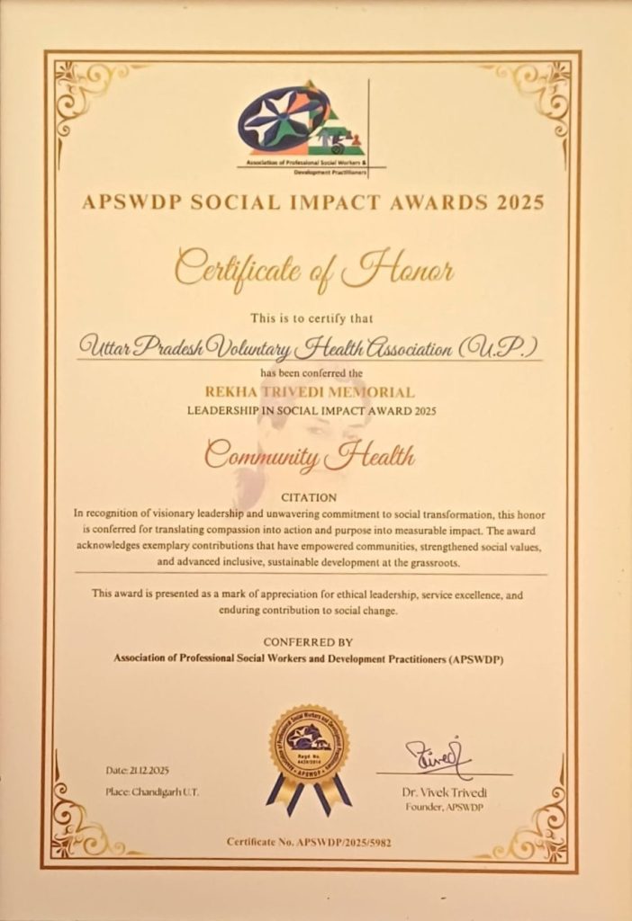 Uttar Pradesh Voluntary Health Association (UPVHA) was honoured with the Rekha Trivedi Memorial Leadership in Social Impact Award 2025 (Community Health) at the Two-Day Workshop on “Environment & Youth: Advancing Climate Adaptation and Mitigation through NGO Leadership”, held on 20-21 December 2025 at Panjab University, Chandigarh. This recognition reaffirms UPVHA’s continued commitment to ethical leadership, community health, youth engagement, and sustainable climate action at the grassroots.